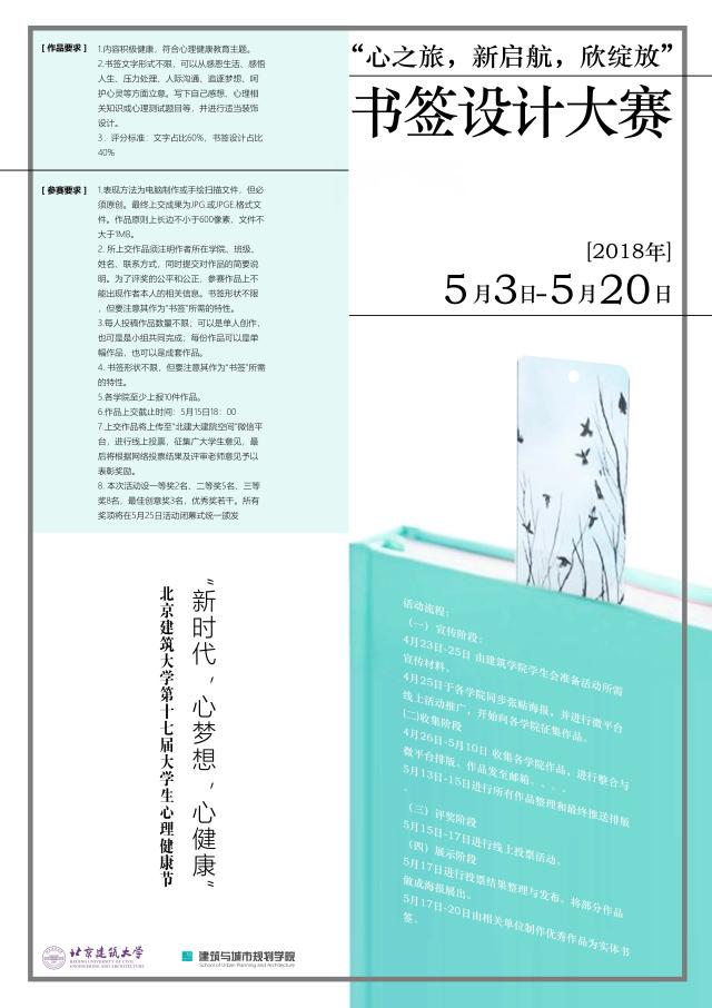 2.所上交作品须注明作者所在学院、班级、姓名、联系方式,同时提交对作品的简要说明,为了评奖的公平和公正,参赛作品上不能出现作者本人的相关信息,书签形状不限但注意其作为“书签”所需的特性